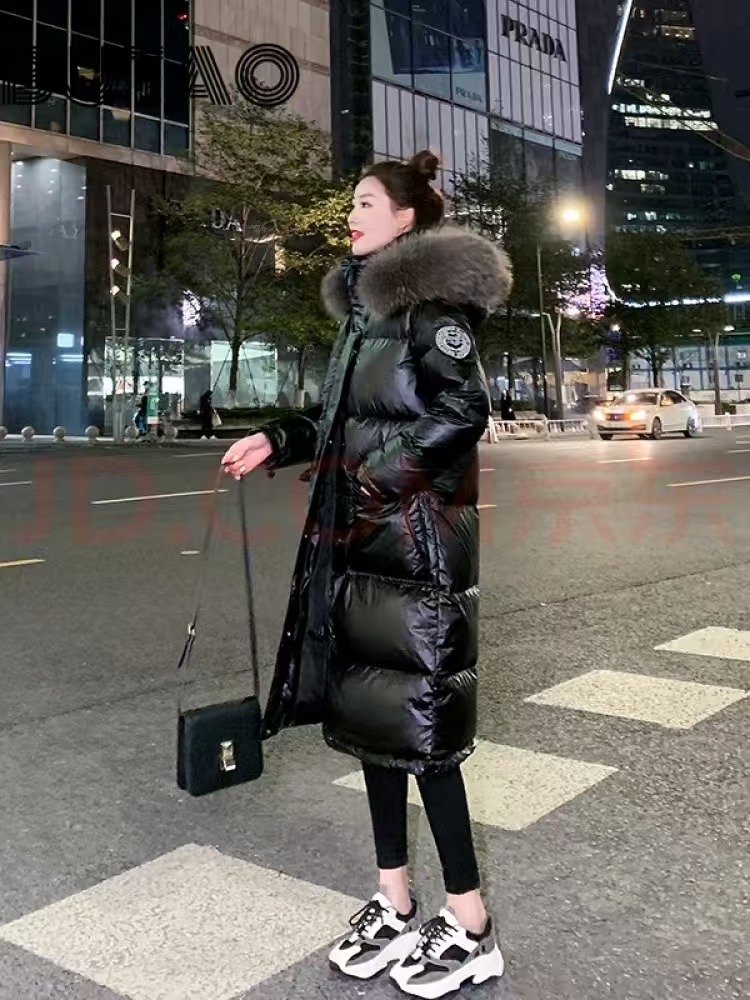 BUTAO连帽羽绒服女士新款冬季中长款亮面大毛领过膝宽松外套